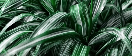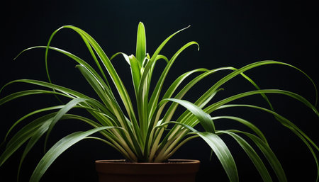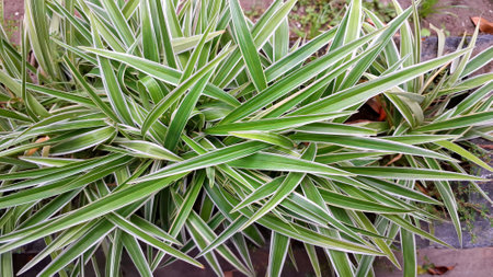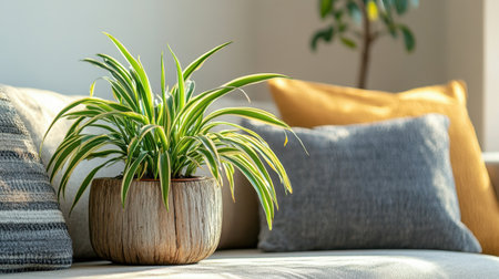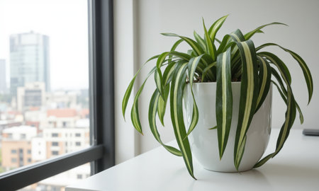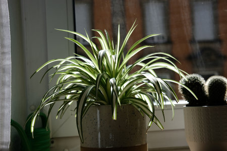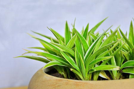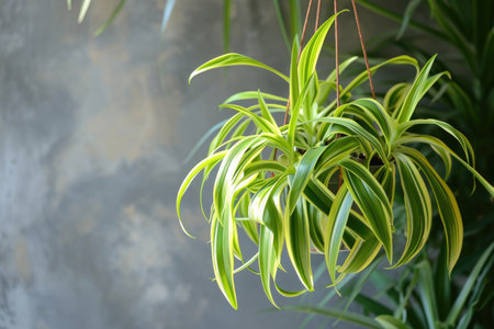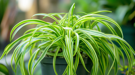 Indoor Spider Plant with Striped Leaves: Close-Up of Chlorophytum Comosum, a Vibrant Green Air Purifying Houseplant for Office and Home Greenery