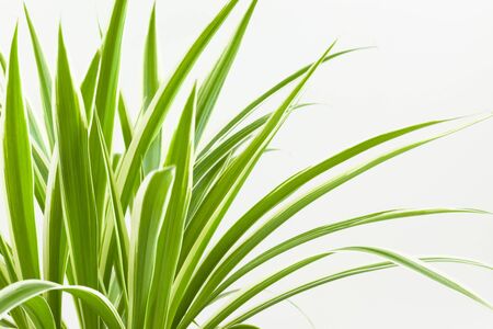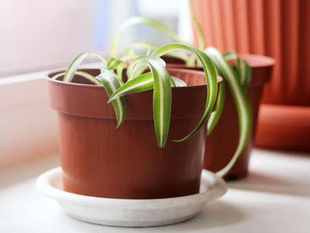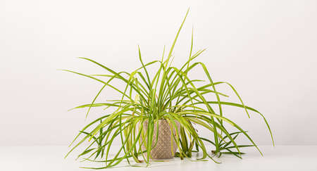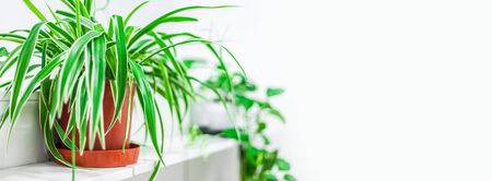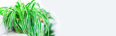 House plant Chlorophytum comosum on white table. Banner with space for text
