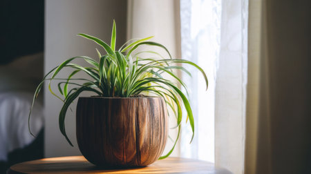 A handcrafted wooden hanger pot housing a vibrant spider plant, hanging in a modern green-living space.