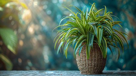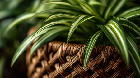 Vibrant green spider plant displays its elegant, arching leaves, nestled inside a beautifully woven basket.