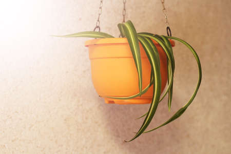 Chlorophytum comosum, Spider plant in white hanging pot / basket, Air purifying plants for home, Indoor houseplant, Houseplants With Health Benefits concept