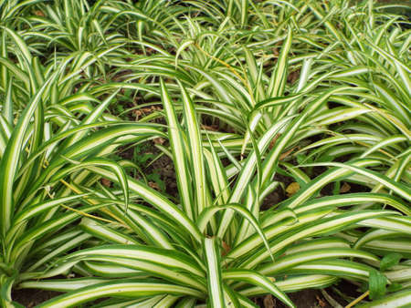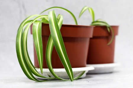 Spider Plant (Chlorophytum comosum) Air-purifying houseplant with arching green and white striped leaves, grown in hanging baskets or on shelves,