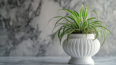 A vibrant green plant elegantly displayed in a decorative white pot on a marble table. The soft-focused gray background enhances the serene ambiance, ideal for decor.