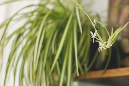 Spider plant white flowers close up on background of room with plants. Chlorophytum blooming flowers and green striped leaves, pot on wooden shelf. Houseplant