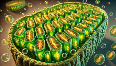 A scientific view of plant cells under a microscope, showcasing chloroplasts and the process of photosynthesis in a detailed abstract.