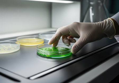 A researcher wearing sterile gloves carefully handles a petri dish containing a vibrant green microbial culture under laboratory conditions. this illustrates biological testing, scientific discovery, and medical diagnostics.