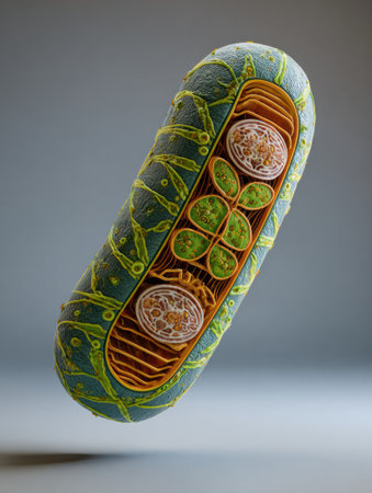 Detailed examination of a chloroplast revealing its thylakoids and stroma involved in energy conversion during photosynthesis.