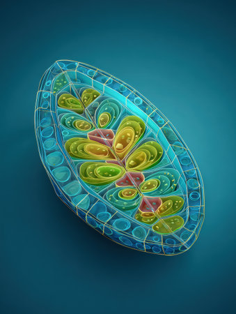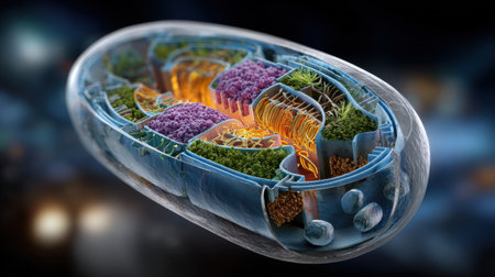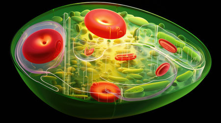 Highly detailed cross-section of a plant cell showing chloroplasts, mitochondria, and the nucleus under a bright light