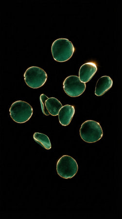 Green gemstone slices with gold edges scatter across a deep black backdrop. Translucent surfaces and metallic rims create contrast and dimensional depth for jewelry styling, pattern design and luxury product visuals