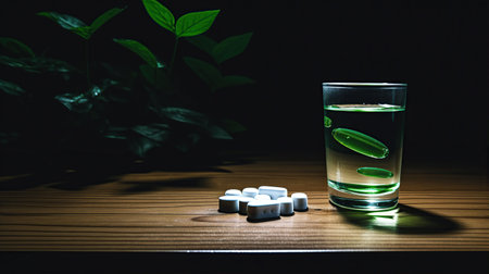 Pills tablets spilling on wood table. Created with Generative AI