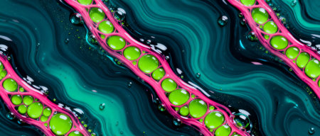 Vibrant abstract pattern with flowing teal waves and bright pink lines containing green circular shapes in a fluid composition.