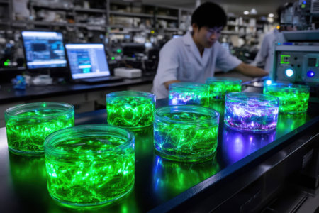 Bright green microalgae thrive in petri dishes within a modern laboratory, embodying innovation in biotechnology and sustainable research practices for ecological advancements.