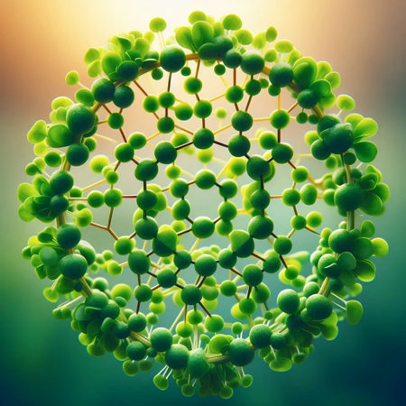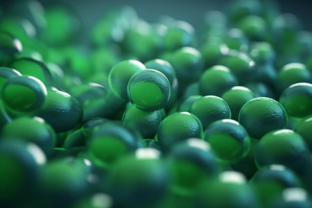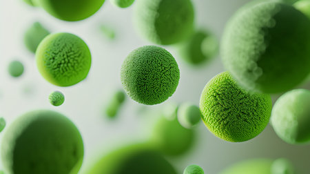 This close-up image depicts vibrant microbial structures featuring green and yellow spheres, perfect for scientific illustrations and educational material on microbiology and cellular life.