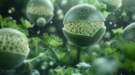 Melon balls with intricate patterns float among lush green foliage, covered in dew droplets that reflect light and enhance their vibrant colors.