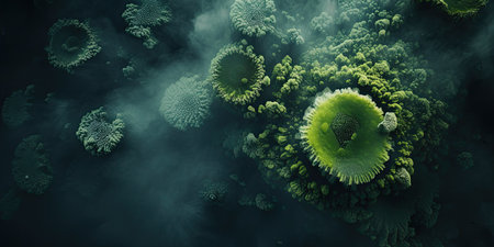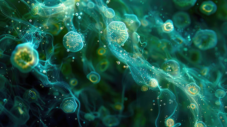 Explore the intricate world of microorganisms with this abstract image highlighting vibrant green structures. Perfect for science and biology themes.
