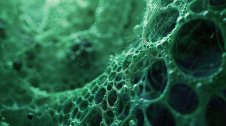 Closeup of vibrant green microscopic organisms, intricate and detailed