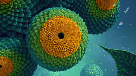 A detailed macro view showcases vibrant green and orange circular microscopic organisms with striking radial patterns and internal structures.