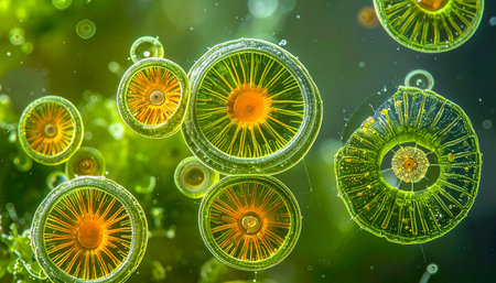 A detailed macro view showcases vibrant green and orange circular microscopic organisms with striking radial patterns and internal structures.