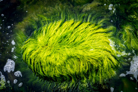 This stunning close-up displays vibrant green algae with intricate round structures. The natural setting emphasizes the beauty of microscopic life, highlighting the details of each cell.