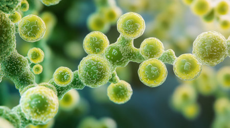 This close-up image depicts vibrant microbial structures featuring green and yellow spheres, perfect for scientific illustrations and educational material on microbiology and cellular life.