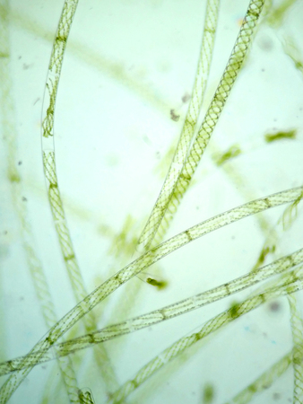 Microscopic View of Filamentous Algae (Oedogonium) with Potential Dwarf Male Filaments