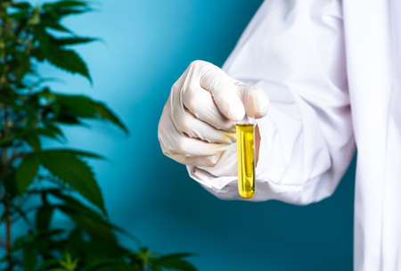 Scientist holding cannabis oil close up, alternative medicine abstract