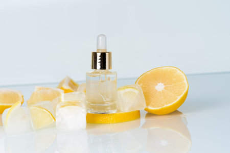 face serum with lemon, cosmetic ice cream with lemon and vitamin C for skin care on a blue light background, natural organic ingredients for home care, detox. place for text.