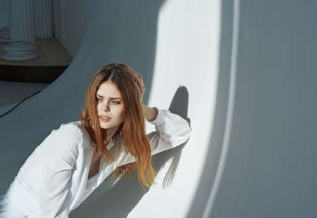 woman model in light clothes indoors sunlight cropped view