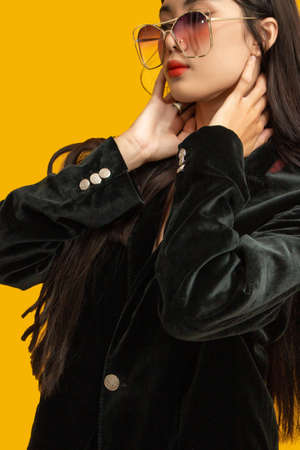 Fashion concept, Fashionable woman posing looking down and wear black coat and sunglasses in studio.