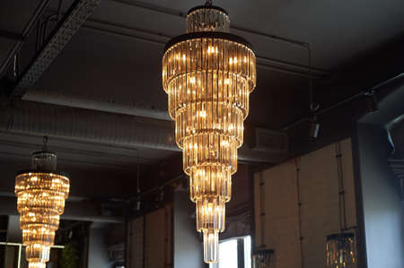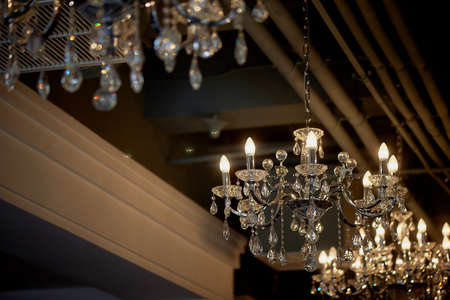 Several crystal chandeliers under the ceiling. Luxury and brilliance