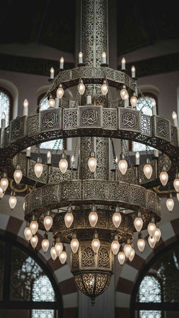 Beautiful ornamental ceiling lamp in the interior of a mosque.