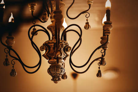 On the old and elegant chandeliers, lamps in the form of candles glow in the evening twilight. Decorative luxury lighting of the room. A palace or a hotel.