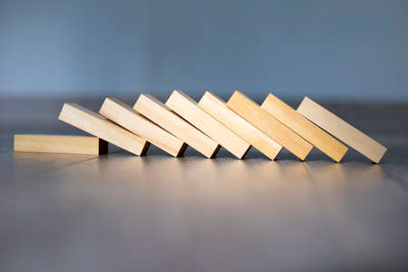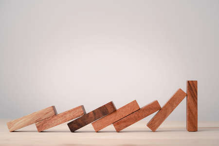 Wooden pieces domino effect stopping with stand wooden pieces. Concept: Business crisis and risk protection concept.