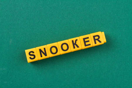 Yellow cubes with inscription snooker on green background. Space for text. Flat lay.