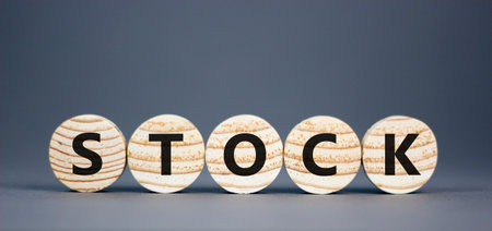 Stock symbol. Concept word Stock on beautiful wooden circles. Beautiful gray table gray background. Business lifestyle stock concept. Copy space.
