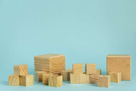 Construction of wooden cubes on blue background with copy space. Mockup composition for design.