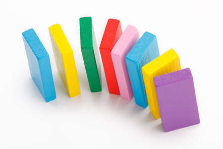 Playing dominoes on a wooden table. Dominoes game concept.Falling dominoes. Domino effect, chain reaction and disaster business.Action and reaction to balance business, chain row, disaster strategy
