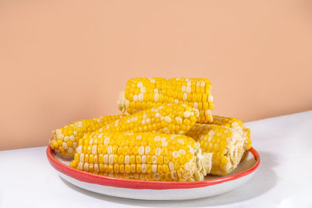 Sweet boiled corn cobs portions on plate, copy space