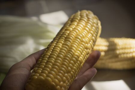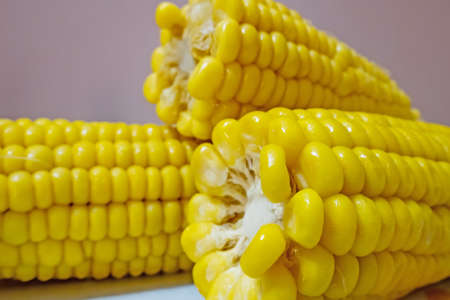 Close up shot of corn cobs, yellow grains of maize. Agriculture and healthy eating concept.