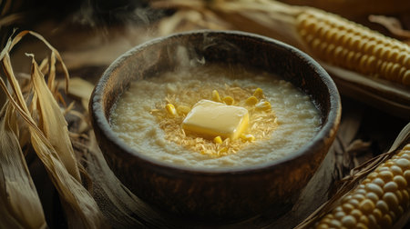 A bowl of steaming milk corn porridge with a golden pat of butter melting on top, surrounded by fresh corn cobs