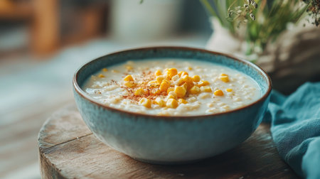 A creamy bowl of milk corn porridge topped with sweet corn kernels, ready to serve on a cozy kitchen table