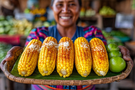 Smiling indigenous woman offering a basket of elote, grilled corn on the cob seasoned with chili powder, cheese, and lime, at a vibrant market
