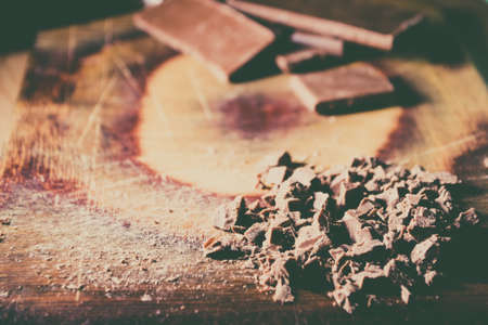 Chopped chocolate on kitchen wooden board.
