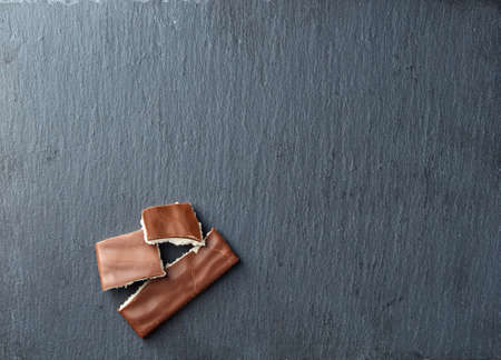 A few pieces of milk chocolate on dark background with copy space, close-up, top view.