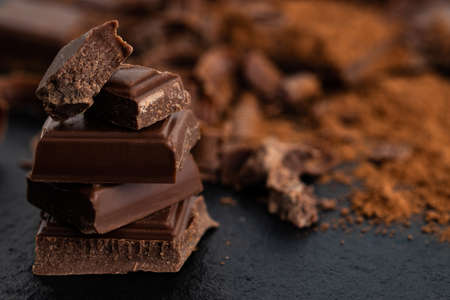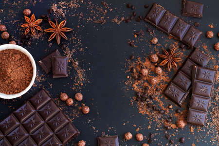 Brown cocoa powder in the spoon on chocolate bar, chopped chocolate cubes on dark background with copy space.