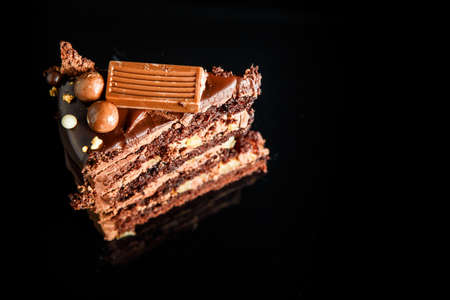 top view piece of tasty chocolate cake with creamy inter layer decorated with chocolate candy served on black background