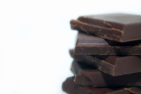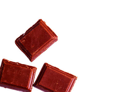 Pieces of chocolate on a white background. White background. Milk chocolate in pieces. Broken chocolate bar.