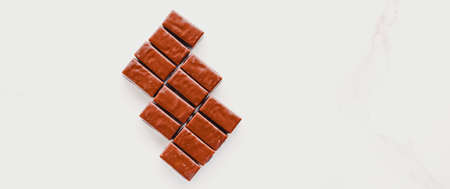 Chocolate pieces on a brown background, top view, close-up