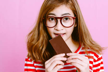 Beautiful woman eating dark chocolate on pink background