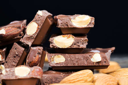 delicious roasted almonds and large pieces of chocolate on a wooden table, close-up of natural cocoa products with added sugar